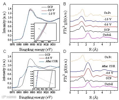 图3.Cu单原子催化剂的电化学原位同步辐射表征SA Cu-PNC (A,B)和SA Cu-NC(C,D)