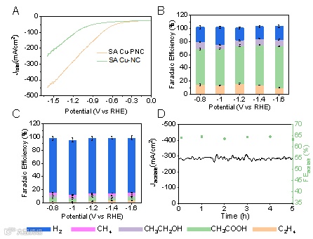 2. SA Cu-PNC成功的通过E-R机制实现了*CO-CO耦合,在ECOR反应中实现了优异的活性和选择性,在−1.6 V vs RHE的电位下, C2+产物的选择性为81.5%,其中乙酸的选择性达到63.9%和286 mA/cm2的分电流密度。