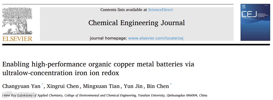 近日,来自燕山大学的青年教师闫长媛、陈彬,在国际知名期刊《Chemical Engineering Journal》上发表题为“Enabling high-performance organic copper metal batteries via ultralow-concentration iron ion redox”的研究文章。该工作利用电解质的协同效应,以N-甲基吡咯烷酮 (NMP) 体系为基础,采用1 m Cu(OTf)2+0.05 m FeCl3有机电解质构建了一种新型铜金属电池。研究机理表明,该有机电解质在Cu||PANI电池和Cu||CuFe-PBA电池中均实现了三步稳定的氧化还原反应。有趣的是,超低浓度氯离子的配位不仅有效稳定了Cu+,而且使得两个独立的氧化还原反应(Cu2+/Cu+和Cu+/Cu0)能够进行。同时,超低浓度的Fe3+实现了与Fe2+的有效转化。因此,设计的含有0.05 m FeCl3添加剂的有机铜离子电解质对金属铜表现出出色的热力学稳定性,使得Cu||Cu对称电池在0.5 mA h cm−2下保持4000小时(~167 天)的循环寿命,这是迄今为止铜离子电池中最高的。受益于Fe3+/Fe2+的氧化还原反应,Cu||PANI电池在2000次循环后表现出85.60%的高容量保留率,这项工作为优化铜金属电池电解质配方开辟了前所未有的可能性。