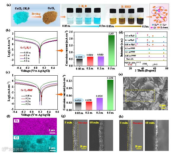 NMP是一种极性有机溶剂,其羰基具有强电负性,且NMP的供体数(DN,27.3 kcal mol-1)高于水分子(18.0 kcal mol-1),这表明其更倾向于与铜离子配位并解离CuCl2电解质中的阴阳离子对。在三电极测试的Tafel曲线中,与CuCl2-H2O电解质相比,CuCl2-NMP电解质中较高的峰值电位表明其对Cu阳极具有更高的稳定性。然而,对应的腐蚀电流会随着CuCl2浓度的增加而显著增加。此外,X射线衍射分析表明,Cu阳极在不同浓度的CuCl2-H2O电解液中浸泡2 h后,在28.5°、47.4°和56.2°附近出现了新的特征峰,这些峰来自白色的立方结构的CuCl (PDF#81-1841)。因此,Cu阳极在低浓度的CuCl2-NMP电解质中才能够显示出优异的热力学稳定性。