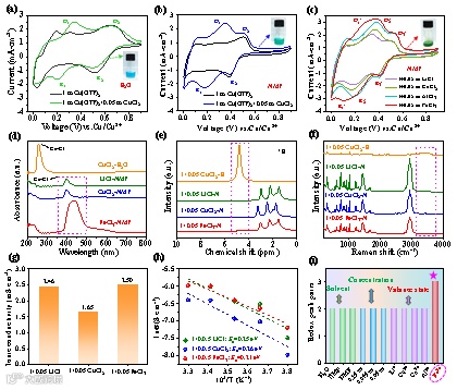图4. 协同的CuCl2和FeCl3-NMP电解质的电化学性能和光谱表征。