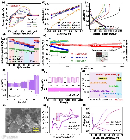 作者展示了电流密度为2 A g-1时Cu||PANI电池的长期循环性能。在1+0.05 FeCl3-NMP电解质中,Cu||PANI电池经2000次循环后放电比容量为108.7 mAh g-1,容量保留率为85.60%。而采用1+0.05 CuCl2-NMP和1+0.05 LiCl-NMP电解质的Cu||PANI电池出现严重的容量衰减现象。此外,组装的Cu||Cu对称电池在面积容量为0.5 mAh cm-2、极化电压约为20 mV的情况下能够稳定运行4000小时(约167天),这与之前报道的一步或两步氧化还原反应的铜离子电池相比,其表现出优异的循环寿命。总体而言,设计的具有超低浓度Fe3+的NMP电解质显着提高了铜金属电池的放电比容量和循环稳定性。这项工作强调了FeCl3在增强电化学储能方面的重要作用,并为开发高性能铜金属电池提供了新的机遇。