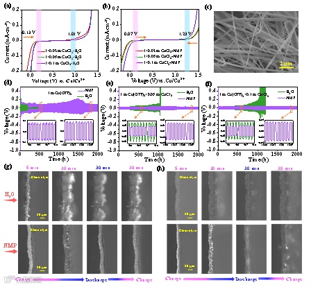 图3. 金属Cu阳极在Cu(OTf)2+CuCl2水系和NMP体系电解质中的铜电镀/剥离行为。