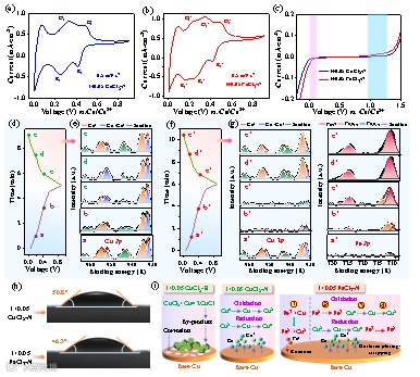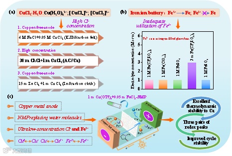 金属铜(Cu)阳极具有高的反应电位(0.34 V vs. 标准氢电极),这使得其在水系电解质中具有相对高的热力学稳定性。因此,近年来,铜金属电池引起了人们的广泛关注。在二次储能电池的研究中,多步氧化还原反应可以明显提升电池的能量密度。目前,水系CuCl2电解质中氯离子的稳定配位能够使得Cu2+和Cu+共存,这使得其成为一种能够促进多种氧化还原反应发生的有前途的铜离子电解质。然而,巨大的挑战来自于水系CuCl2电解质和金属铜之间的强烈化合反应,这阻碍了基于变价铜离子电解质的高性能的铜金属电池的开发。因此,在铜金属电池中,采用有机CuCl2电解质有望实现多步稳定的氧化还原反应,然而,此类研究仍未得到探索。众所周知,铁离子主要以Fe2+和Fe3+的形式存在,但目前已报道的基于水系Fe(CF3SO3)2、Fe(ClO4)2和FeSO4电解质的铁离子电池均以Fe2+而非Fe3+作为主要电荷载体。值得注意的是,考虑到金属铁比金属铜具有更强的还原性,推测在铜金属电池中使用高价态的Fe3+电解质可能具备更加理想的氧化还原动力学,同时这也有助于Fe3+电化学储能的应用。