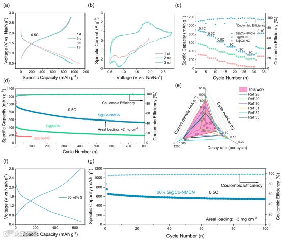 图5 Na-S全电池的电化学性能。(a)扫描速率为0.1 mV s-1时的前三圈CV曲线。(b)S@Co-NMCN在0.5C特定电流率下的第一、第三、第五、第七圈的电压容量曲线。(c)不同阴极在0.1C、0.2C、0.5C、1C、2C和3C的特定电流速率下的倍率能力。(d)S@Co-NC、S@MCN和S@Co-NMCN在0.5C下的长循环性能。(e)与其他文献比较的循环性能。(f)0.5C下的第一电压容量曲线和(g)硫负载为60wt.%的长期循环性能。