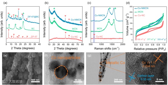 图2 Co-NMCN的表征及其优点。(a)ZIF-67@BC,BC,ZIF-67前体的XRD图谱。(b)Co-NMCN、MCN和Co-NC的XRD图谱、(c)拉曼光谱和(d)N2吸附/解吸曲线。(e)Co-NMCN的SEM、(f)TEM和(g)HRTEM图像。