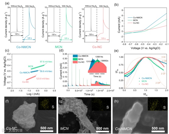 图3对NaPSs的电催化能力和Na2S成核行为。Co-NMCN、MCN和Co-NC对应的(a)计时电流曲线,(b)LSV曲线和对应的(c)硫化物氧化反应塔菲尔图。(d) PITT曲线和相应的(e)不同的无量纲瞬态成核模式。(f-h)Na2S沉积后的SEM和相应的S元素EDS图像。
