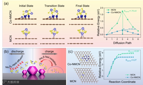 图4 Na2S成核和催化机理的理论分析。(a)DFT计算了Co-NMCN和MCN上的Na2S6迁移路径,描绘了初始、过渡和最终状态以及相应的能量分布。(b)示意图显示了Na2S在Co-NMCN上的3D沉积和快速氧化。(c)DFT计算了Na2S的分解能垒并进行了相应的理论模拟。