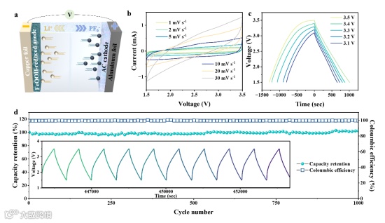 图4. 设计了界面电容在FeOOH-reduced//AC非对称锂离子电容器中的应用。a) FeOOH-reduced//AC LIC中电容行为的结构图。b) 不同扫描速率下的CV曲线。c) 0.2 A g-1下不同电压范围内的恒电流充电/放电电压分布。d) 在1A g-1下,1.5 V至3.5 V的电压范围内的长期循环性能和相应的库仑效率。插图显示了在1 A g-1的恒定电流密度下的充放电曲线。