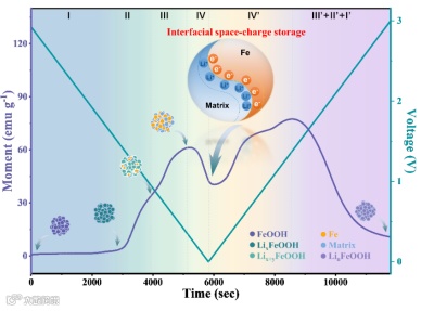 图1. 原位磁性测试揭示了锂离子电池中顺磁性FeOOH的动态演变:在放电过程中,还原出超顺磁性Fe/界面空间电荷存储(可逆额外容量)导致的磁性上升/下降;充电过程反之。
