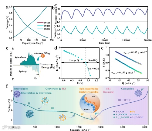 图2. FeOOH LIB在0.01 V至1 V的指定电压范围内的可逆界面电荷存储机制。a) 100次循环后的恒电流放电-充电曲线。b) 3 T外加磁场下的恒流电化学磁响应。c) 示意图显示了还原铁磁金属晶粒中费米面附近的自旋极化态密度。d-e) 界面电荷存储过程的热力学拟合。f) 额外的锂存储/界面空间电荷存储示意图。