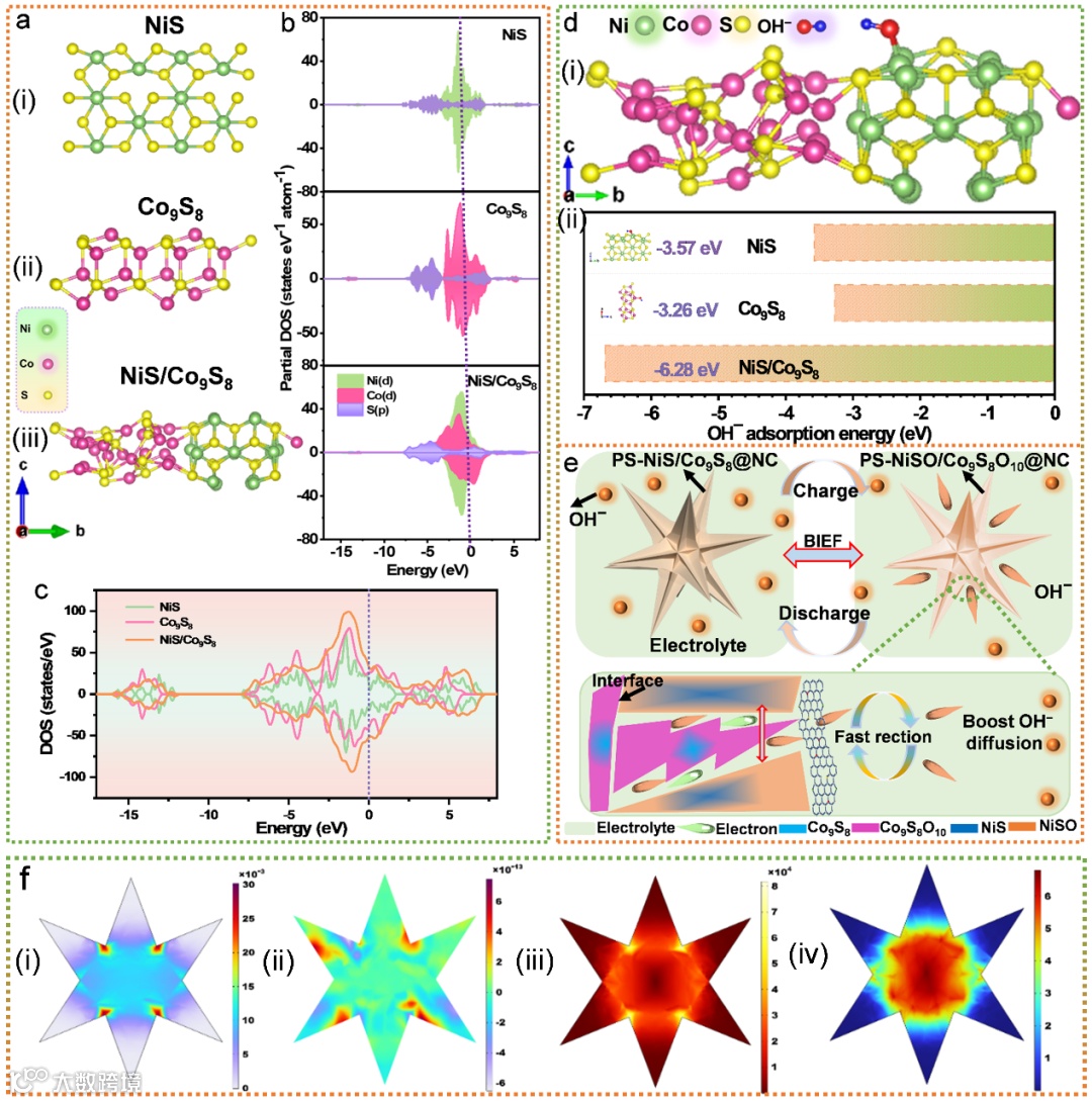 电极反应动力学滞后、结构稳定性差是阻碍过渡金属硫化物在存储OH−方面应用的主要问题。本文通过密度泛函理论(DFT)计算,研究了NiS/Co9S8异质界面增强OH−储存反应动力学的机理。为了深入分析界面性质和储能行为的关系,对NiS/Co9S8异质结构上可能存在的OH−的吸附位点进行建模,表明构建NiS/Co9S8异质结构可以显著提高电极对OH−的吸附能力和降低离子扩散能垒,实现更快速的OH−储存。基于以上实验和理论计算结果,对OH−在PS-NiS/Co9S8@NC异质结中的快速反应动力学行为进行了推理。并通过COMSOL模拟建立相关模型探索PS-NiS/Co9S8@NC复合物的相关物理性能,验证了三角构型在稳定PS-NiS/Co9S8@NC电极结构等方面的优点。