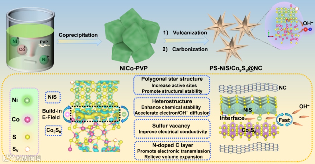 以NiCo-PVP为前驱体,通过离子反应竞争策略原位构建了具有分子水平异质结和S空位的多角星状PS-NiS/Co9S8@NC,用于高性能氢氧根离子超级电容器。原位异质结的形成是利用NiCo-PVP前驱体中Ni2+、Co2+与硫离子的溶度积的区别来实现的,衍生于同一前驱体的紧密结合的分子水平NiS/Co9S8异质结,其丰富的异质界面引发了强烈的电子相互作用,诱导周围的电荷发生再分配从而形成界面内置电场以改善离子/电子的传输。