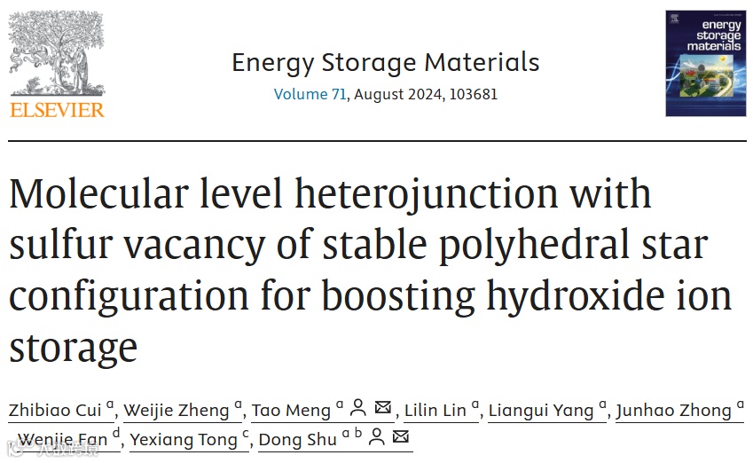 基于此,来自华南师范大学的舒东教授和孟涛副研究员,在国际知名期刊Energy Storage Materials上发表了题为“Molecular Level Heterojunction with Sulfur Vacancy of Stable Polyhedral Star Configuration for Boosting Hydroxide Ion Storage”的观点文章。