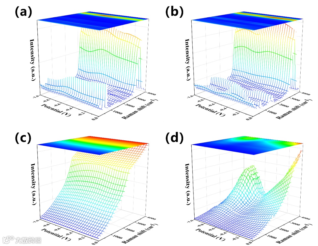 利用operando Raman进一步研究了催化剂在铂化前和铂化后的表面物质及其在HER过程中化学键的变化。通过在不同电压条件下原位拉曼实验,分析了拉曼峰强度变化,证明了铂化可以使本身不具有催化活性的催化剂重新配置,从而提高催化剂的催化活性。