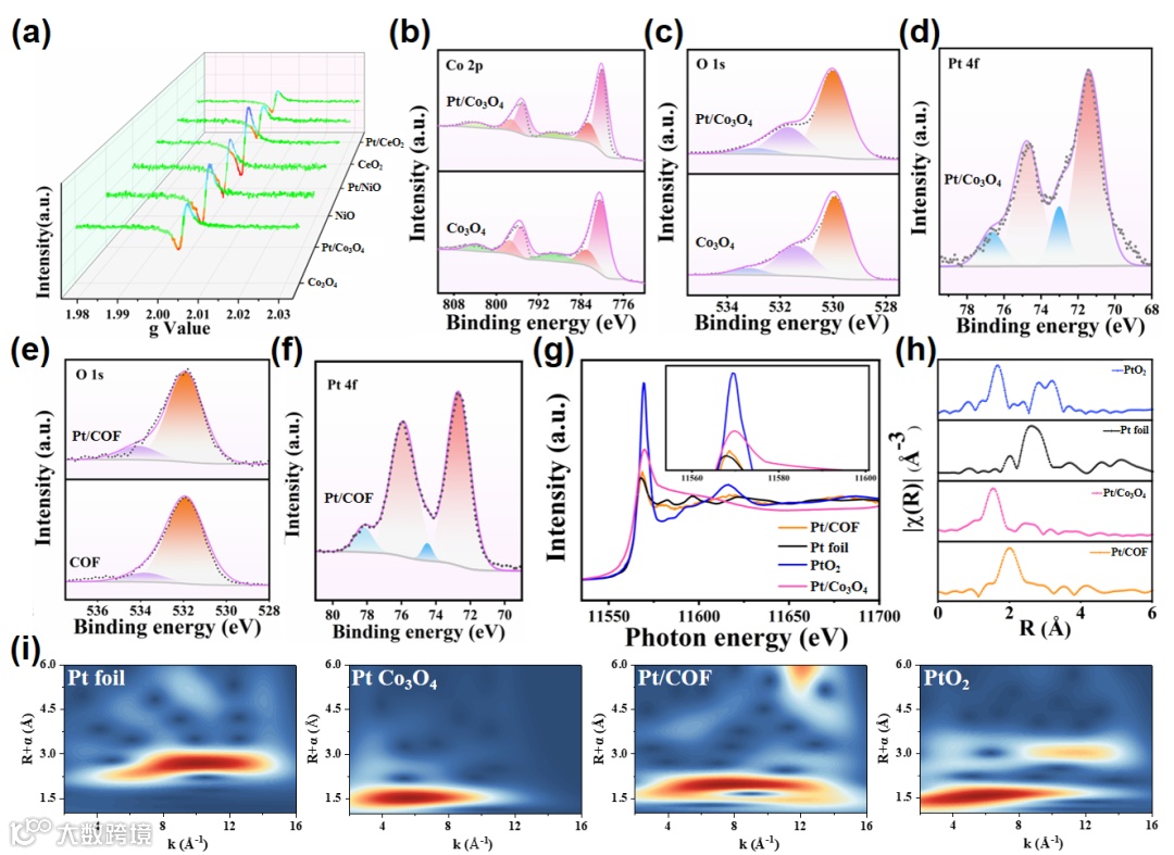 图4. (a) g值在2.002附近的EPR模式。(b, c) Co3O4和Pt/Co3O4的Co2p的高分辨率XPS光谱。(d) Pt/Co3O4中Pt 4f的高分辨率XPS光谱。(e) COF和Pt/COF的O1s高分辨XPS光谱。(f) Pt/COF中Pt 4f的高分辨率XPS光谱。(g) Pt/COF、Pt箔、PtO2和Pt/Co3O4的x射线吸收研究(插图:局部放大)。(h) PtO2、Pt箔、Pt/Co3O4和Pt/COF在Pt L3边缘的归一化XANES光谱。(i) Pt箔、Pt/Co3O4、Pt/COF和PtO2的EXAFS小波变换。