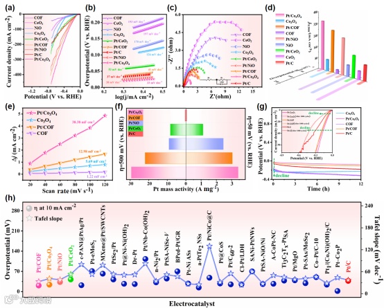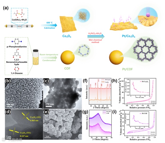 图1. 材料的制备及微观结构表征。(a) Pt/Co3O4和Pt/COF的制备工艺示意图。(b) Pt/Co3O4的SEM图像。(c) Pt/Co3O4的TEM图像。(d) Pt/Co3O4的HRTEM图像。(e) Pt/COF的SEM图像。(f) Pt/Co3O4和Co3O4的XRD谱图。(g) Pt/COF和COF的XRD谱图。(h) Pt/Co3O4的氮吸附-解吸等温线(插图:Pt/Co3O4的孔径分布)。(i) Pt/COF的氮气吸附-解吸等温线(插图:Pt/COF的孔径分布)。
