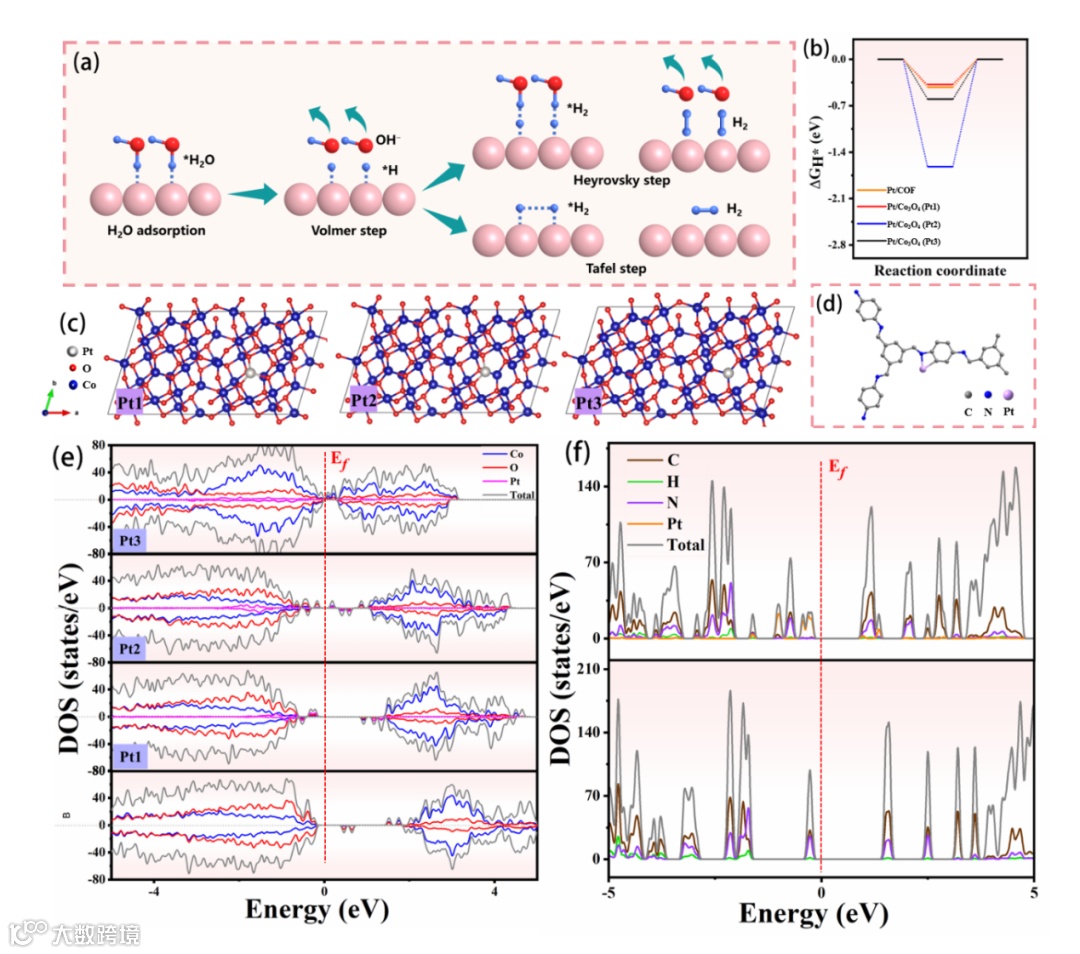 图5. (a)电催化HER的反应机理说明。(b)H*在Pt/Co3O4和Pt/COF表面的吸附自由能。(c) Pt/Co3O4和(d) Pt/COF的原子结构模型。Ptδ+以经典方式取代Co3O4中的Co原子(Pt1)和OV相邻的Co原子(Pt2),Co3O4中富电子OV的存在导致Ptδ+通过静电吸附部分填充OV (Pt3)。(e) Pt/Co3O4和(f) Pt/COF在对准费米能级下的PDOS分析。