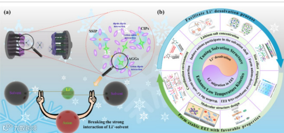 图1. (a)从原子角度解释溶剂化结构调控提升低温动力学的机理,(b)溶解化结构调控策略-低温性能关联示意图。
