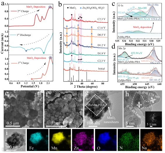 通过XRD、XPS和SEM图像证实了通过宽窗口CV电化学氧化沉积二氧化锰,纳米片状的二氧化锰成功沿Mn-PBA立方块外部生长。同时在充放电过程中观察到纳米片的可逆沉积溶解变化。这一预沉积过程结果表明以Mn-PBA作为二氧化锰的反应界面,提高二氧化锰沉积溶解效率具有积极作用。