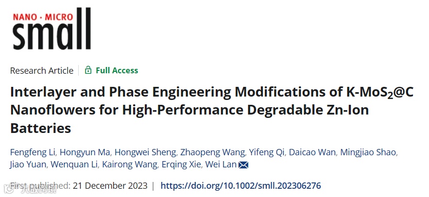 Y. Qi, F. Li, H. Sheng, H. Zhang, J. Yuan, L. Ma, H. Bi, Y. Ma, W. Li, and W. Lan*, Seed-Assisted Reversible Dissolution/Deposition of MnO2 for Long-Cyclic and Green Aqueous Zinc-Ion Batteries Small 2024, 202404312.