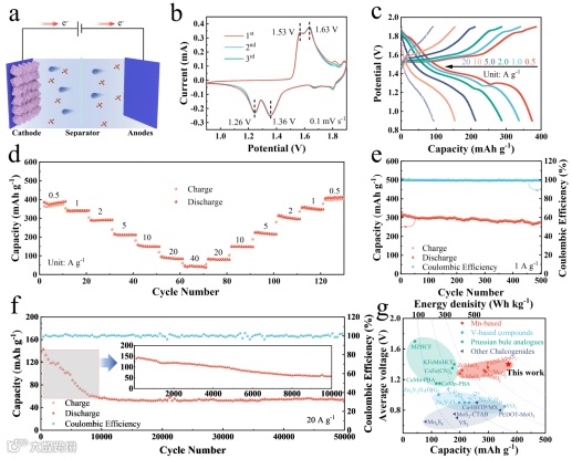MnO2@ZnMn-PBA在1 A g-1下具有273 mAh g-1的比容量,在20 A g-1下经过50000次循环容量依然有52.3 mAh g-1,展示出高的可逆比容量、杰出的倍率性能和优异的循环稳定性。