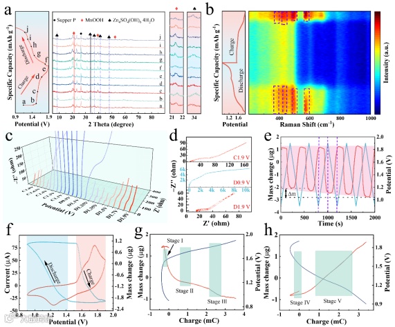 图4 (a) MnO2@ZnMn-PBA在0.9-1.9 V下的原位XRD图样和GCD曲线;(b) MnO2@ZnMn-PBA在电流密度为400 mA g-1的放电/充电过程中的原位拉曼光谱;(c、d)MnO2@ZnMn-PBA在不同电位下的EIS曲线;(e) EQCM测试期间电极质量随电位变化的关系;(f) EQCM测试期间电极质量变化关系和CV曲线;(g、h)在放电和充电过程中,质量和电位分别与电荷变化的关系。