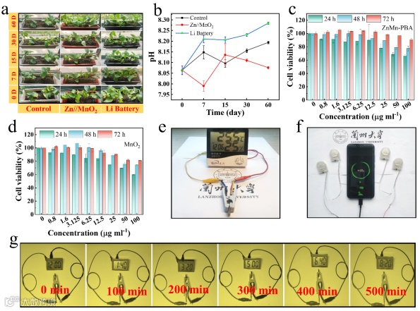 图6 (a) 对照组、MnO2@ZnMn-PBA//Zn AZIB和商用锂电池在不同共培养时间的盆栽实验光学照片;(b) 植物生长土壤的pH值;(c-d) ZnMn-PBA和MnO2分别在24、48和72小时内的细胞活力;(e) MnO2@ZnMn-PBA//Zn为湿度计供电的照片;(f) MnO2@ZnMn-PBA//Zn 串联为智能手机充电的照片;(g) 使用单个MnO2@ZnMn-PBA//Zn器件为电子手表供电的过程。