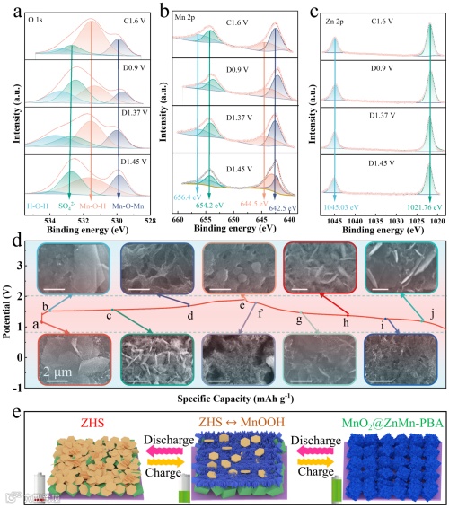图5 (a) O 1s、(b) Mn 2p和 (c) Zn 2p的原位XPS光谱;(d) SEM图像显示了不同电位下的电极表面形貌;(e) MnO2@ZnMn-PBA在充放电过程中的反应模型示意图。