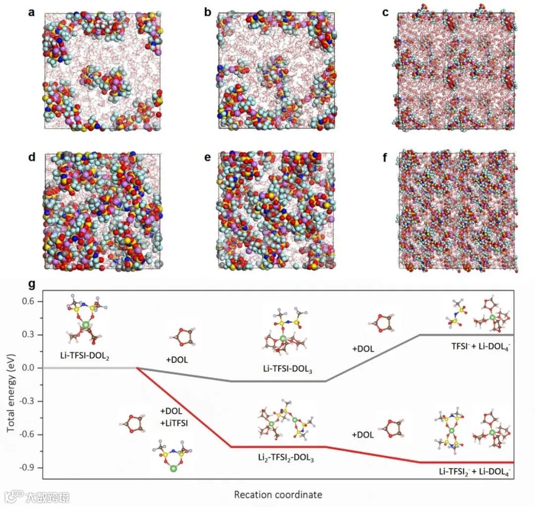 图三:基于MD的电解液结构模拟(a-c)1 M LiTFSI in DOL, (d-f) 2M LiTFSI in DOL