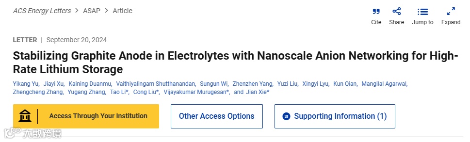 Yikang Yu+, Jiayi Xu+, Kaining Duanmu, Vaithiyalingam Shutthanandan, Sungun Wi, Zhenzhen Yang, Yuzi Liu, Xingyi Lyu, Kun Qian, Mangilal Agarwal, Zhengcheng Zhang, Yugang Zhang, Tao Li*, Cong Liu*, Vijayakumar Murugesan*, Jian Xie*. Stabilizing Graphite Anode in Electrolytes with Nanoscale Anion Networking for High-Rate Lithium Storage. ACS Energy Letters, 2024, DOI: 10.1021/acsenergylett.4c02011