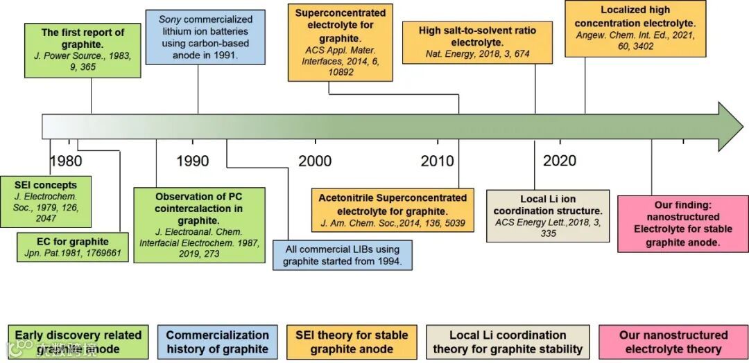 图一:石墨负极发展时间线以及对应的电解液稳定机制进展