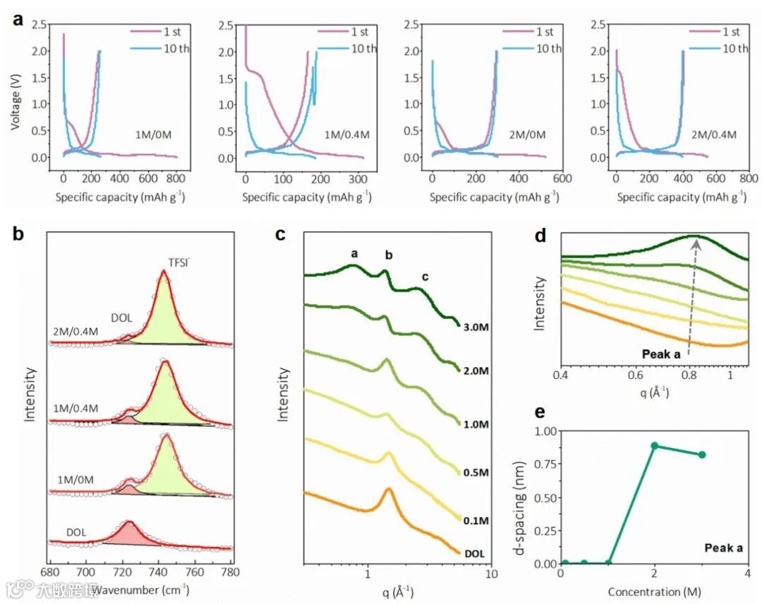 同时1M LiTFSI与2M LiTFSI循环后的石墨也有着类似的SEI结构,却不能解释他们对石墨负极不同的稳定性。这些结果表明,过去基于石墨表面的SEI结构以及锂离子在原子尺度上的配位结构的理论并不能在DOL体系中解释石墨的稳定性。因此,我们通过阿贡国家实验室和布鲁克海文国家实验室的同步辐射光源对电解液进行X射线小角衍射 (SAXS)来研究电解液在纳米尺度上的结构。SAXS结果发现随着LiTFSI浓度升到2M及以上,在0.8 Angstrom-1附近的q range形成新的峰(Peak a),表明电解液中TFSI-形成了纳米尺度规则结构。基于SAXS数据,作者通过分子动力学(MD simulation)模拟了不同浓度LiTFSI在DOL中的电解液结构。研究发现随着LiTFSI浓度从1M上升到2M,LiTFSI倾向于逐渐形成规则的网络结构,而这个阴离子网络结构能够将游离的溶剂分子(1M LiTFSI)限制于网络结构内(2M LiTFSI)。阴离子纳米网络在电解液中的形成降低了溶剂分子与石墨相互作用,从而抑制溶剂分子共嵌进入石墨中。