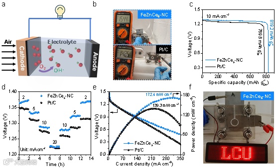 FeZnCe5-NC表现出优异的ORR性能(E1/2=0.88 V,Eonset=1.04 V),且抗甲醇能力和稳定性均优于商业Pt/C,具有一定的应用潜力。将FeZnCe5-NC作为阴极催化剂组装锌-空气电池(图3),测得开路电压为1.544 V,可以成功点亮“LCU”灯板,在恒电流放电和变电流放电测试中均优于商业Pt/C催化剂,其峰值功率密度为172.4 mW cm-2,优于Pt/C的139.3 mW cm-2。