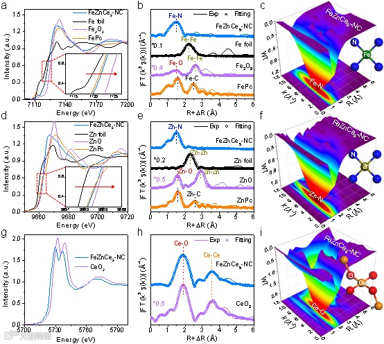 通过同步辐射结构表征(图2),FeZnCe5-NC 中 Fe K边的吸收阈值介于 Fe 箔和 Fe2O3 之间,并接近 FePc,表明 FeZnCe5-NC 中存在带正电的 Fe 物种。在~7114 eV处没有发现与FePc中平面Fe-N4结构对应的指纹峰,表明 FeZnCe5-NC 中的 Fe 可能采用结构扭曲的 Fe-Nx构型。在 R 空间中观察到的 FeZnCe5-NC 的主峰以 1.6 Å 为中心,与 FePc 的主峰非常相似,表明 FeZnCe5-NC 中的 Fe 物种主要为 Fe-N 配位结构。Zn K 边吸收分析结果表明,FeZnCe5-NC 中 Zn 的氧化态介于 Zn 箔和 ZnO 之间,且接近 ZnPc。FeZnCe5-NC 在 R 空间中的主峰(约 1.4 Å)与 ZnPc 大致一致,表明 FeZnCe5-NC 中以 Zn-N 配位为主。Ce L3的近边吸收光谱(XANES)形状与标准 CeO2 相似,表明 Ce 主要处于氧化状态,而不是金属簇的形式。FeZnCe5-NC 中 Ce 的近边吸收能略低,表明氧配位降低。