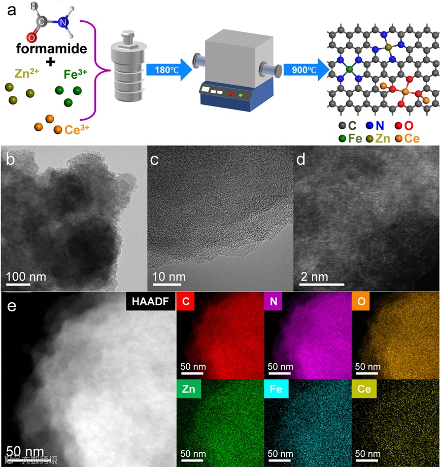 已有相关研究中证明,负载在氮掺杂碳催化剂上的高分散铁(Fe)具有高度可调的配位构型和电子结构。铈(Ce)具有多种电子轨道结构,其特点是具有独特的4f轨道和不同配位数的复杂化学状态。虽然Ce原子在ORR中显示出潜力,但Ce元素在热解过程中通常会聚集,从而导致活性降低和耐用性不佳。该研究通过甲酰胺溶剂热法合成催化剂FeZnCex-NC前驱体,随后在惰性气体下热处理确保高度分散的金属位点均匀分布在碳基体上(图1)。利用锌(Zn)的空间约束效应能够有效地分散和稳定金属物种,从而实现活性金属物种在碳载体上的高分散。此外,Ce和Zn原子对金属活性位点电子结构具有优化辅助效应,可以明显提高Fe原子位点的ORR反应动力学。