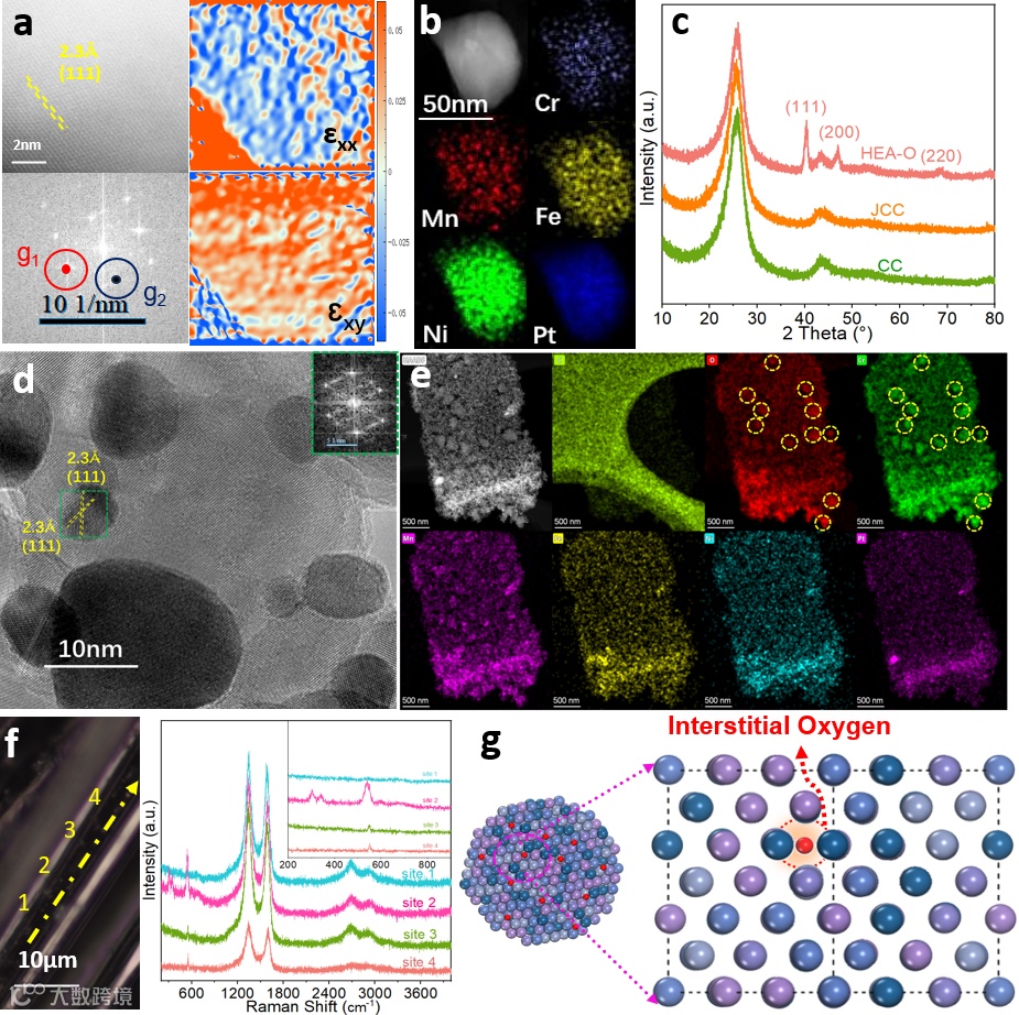 图2. a) HEA-O的AC-STEM图像和相应的GPA图像,b)Cr、Mn、Fe、Ni和Pt的EDS图,c)CC、JCC和HEA-O XRD图,d)HRTEM图像(插入相关部分的FFT图),e)EDS图,f)拉曼显微镜下的HEA-O图像(右图显示了标记为1-4点的拉曼光谱和g)HEA-O模型结构图。