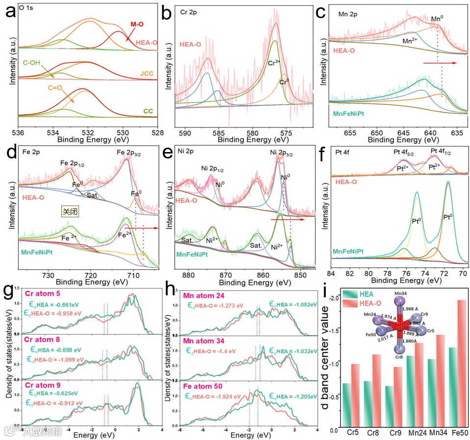 图4 XPS分析a)CC、JCC和HEA-O的O1s,b)HEA-O中的Cr 2p。c)Mn 2p,d)Fe 2p,e)Ni 2p,和f)Pt 4f的HEA-O和MnFeNiPt。g、 h)HEA和HEA-O模型中不同位置元素附近O原子的LDOS。i)HEA与HEA-O的d带中心,以及带有键长值的模型图插图
