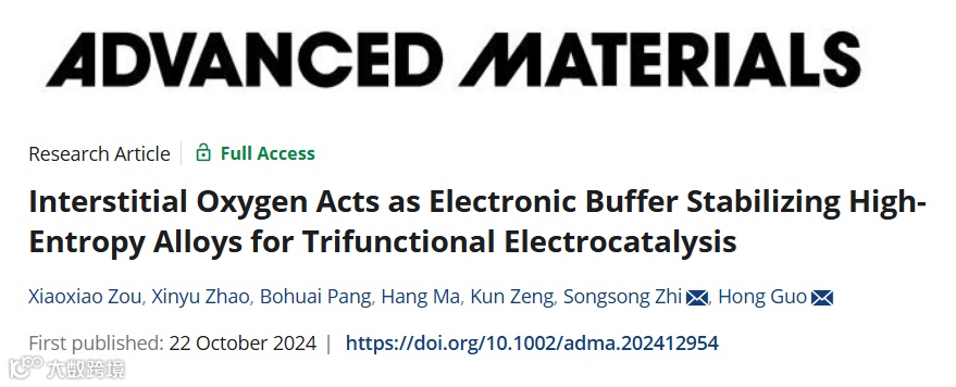 X. Zou, X. Zhao, B. Pang, H. Ma, K. Zeng, S. Zhi, H. Guo, Interstitial Oxygen Acts as Electronic Buffer Stabilizing High-Entropy Alloys for Trifunctional Electrocatalysis. Adv. Mater. 2024, 2412954.