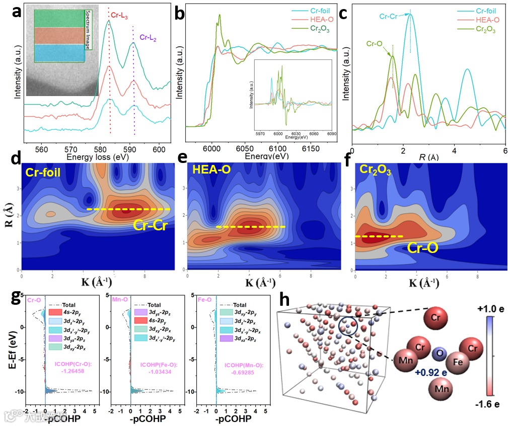 图3. a)Cr的EELS光谱和b)Cr K边的XAS谱,和c)FT-EXAFS光谱d–f)Cr、HEA-O和Cr2O3的小波变换。g) HEA-O模型的Cr-O、Mn-O和Fe-O的COHP分析h)HEA-O的结构由原子电荷着色。