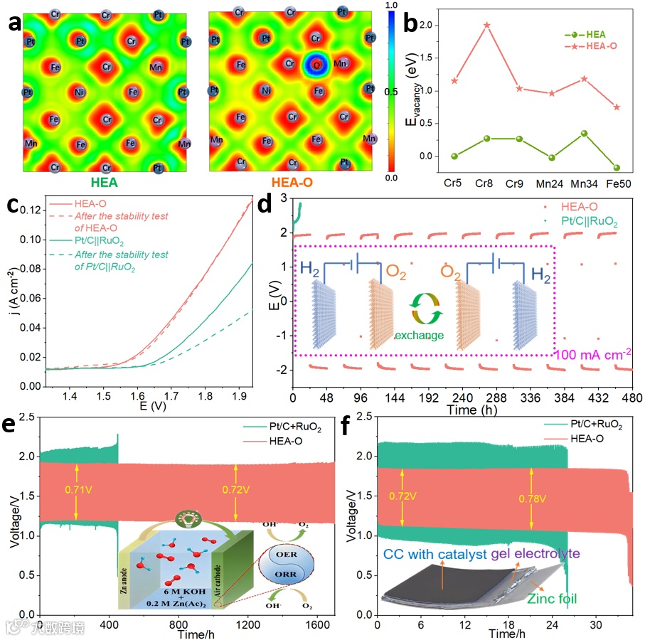 图5 a)HEA和HEA-O的ELF,b)HEA与HEA-O不同位置的空位形成能c)水分解的极化曲线,以及(d)HEA-O和(-)Pt/C||RuO2(+)的水分解稳定性测试。e)水系锌空气电池和f)固态锌空气电池HEA-O和Pt/C+RuO2的充放电循环曲线