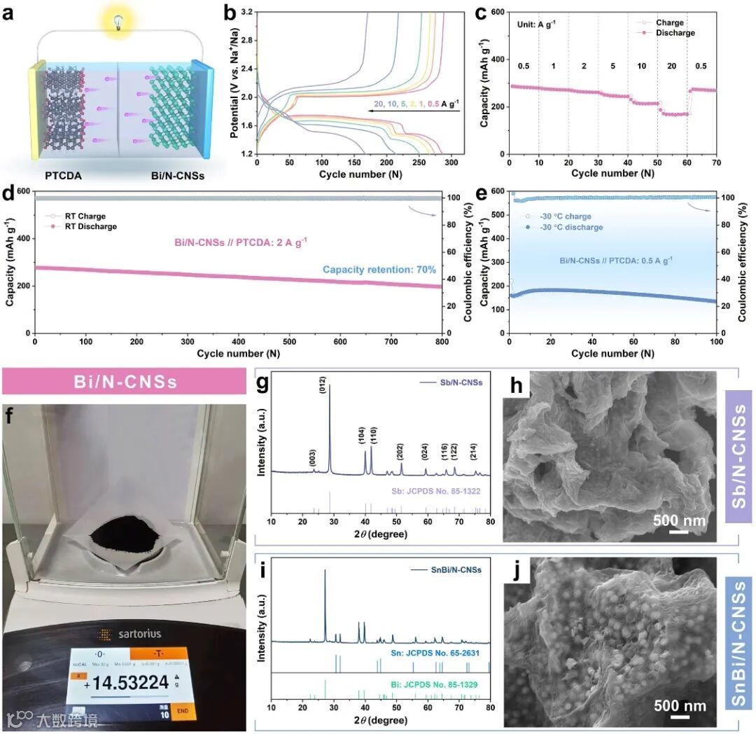 以PTCDA为正极组装的钠离子全电池(Bi/N-CNSs//PTCDA)具有优异的倍率性能(20 A g-1超大电流密度下的可逆容量为171 mAh g-1)和循环稳定性(经过800圈循环仍然具有197 mAh g-1的可逆容量,对应容量保留率为70%)。该全电池分别实现了138 Wh kg-1和9048 W kg-1的最高能量密度和最高功率密度(基于正负极质量之和计算)。此外,Bi/N-CNSs//PTCDA能够在-30 °C下稳定运行(循环100圈后的可逆容量为134 mAh g-1)。该工作进一步探索了Bi/N-CNSs复合材料的应用潜力。在实验室规模下,单次能够制备Bi/N-CNSs复合材料14.53 g,且支持进一步放大生产。该制备方法还能拓展到其他金属基负极材料体系,为开发储钠性能优异的负极材料提供了新思路。
