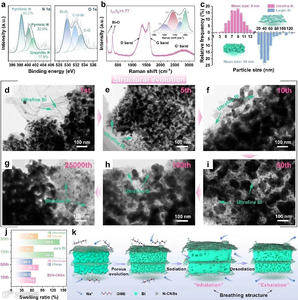 Bi/N-CNSs复合材料中的金属Bi颗粒呈现出尺寸与位置双分级的分布特征。其中,超小Bi颗粒(平均粒径8 nm)锚定在富缺陷氮掺杂碳纳米片上,尺寸稍大的Bi颗粒(粒径介于15~120 nm)夹于纳米片之间形成金属Bi层。该金属Bi层在循环过程中原位多孔化,而超小Bi颗粒基本维持稳定。在柔性碳纳米片和多孔Bi层的相互作用下,Bi/N-CNSs复合材料呈现出“呼吸式”特征的储钠过程。分级Bi分布(多孔Bi+超小Bi)缩短了离子输运距离,提高了高倍率下活性物质的利用率;“呼吸式”的类阵列结构构建了连续的导电和应力释放网络,确保了储钠稳定性。
