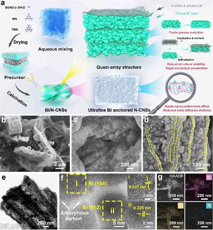 图1. Bi/N-CNSs复合材料的合成示意图及其形貌与结构表征。