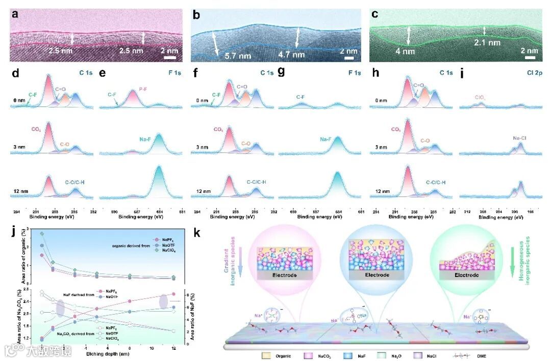 图4. 不同电解液中SEI膜的结构和成分表征。