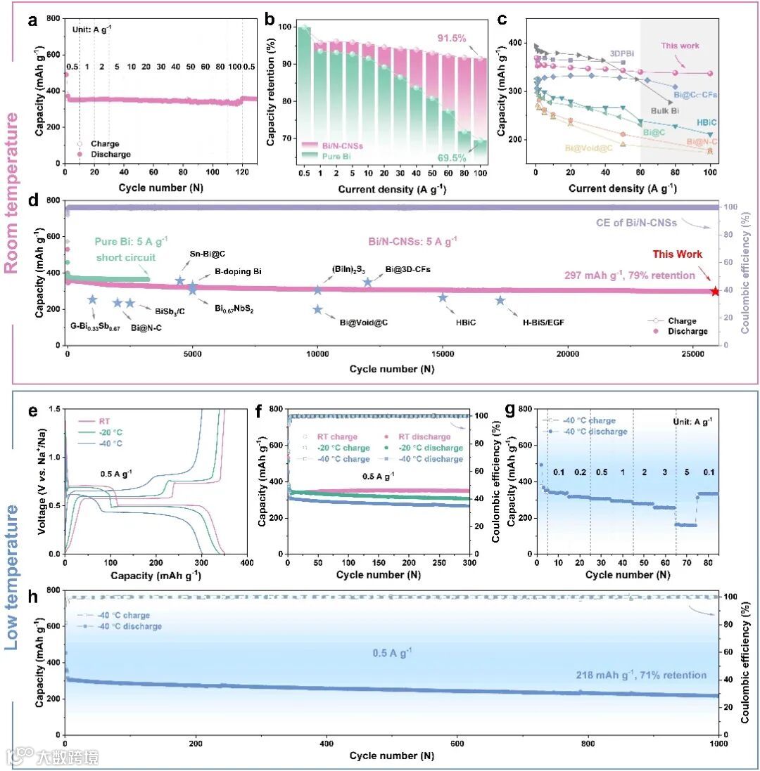 图2. Bi/N-CNSs复合材料的室温和低温储钠性能。