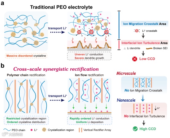 图1 PEO 电解质中低 CCD 的起源以及通过跨尺度整流策略提高 PEO 电解质 CCD 的示意图