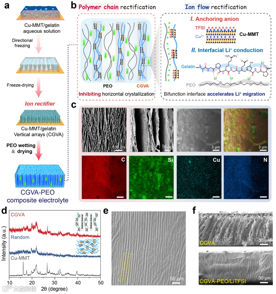 近日,西安交通大学化学学院的丁书江教授,在国际知名期刊Energy Storage Materials上发表题为“Regulating Li+ Transport Behavior by Cross-Scale Synergistic Rectification Strategy for Dendrite-free and High Area Capacity Polymeric All-Solid-State Lithium Batteries”的研究论文。该工作分析了PEO电解质低临界电流密度的起源,并基于跨尺度协同整流策略,开发了一种具有离子整流功能的新型 PEO 复合电解质。从宏观尺度上,离子整流器的阵列结构通过空间限制作用抑制了 PEO中结晶的生长及其在非离子传导方向上的分布,减轻了离子串扰,实现了聚合物链整流。此外,离子整流器表面含有丰富的铜离子和含氧基团,可在微观尺度上分别抑制阴离子传导并加速Li+迁移,从而实现离子流整流。这种策略实现了调控从电解质到阳极界面的均匀、快速和稳定的Li+迁移/扩散行为。PEO 电解质的临界电流密度提高到了 2.5 mA cm-2,表明了枝晶生长抑制能力有了显著提高。令人印象深刻的是,复合电解质具有长期稳定性(0.2 mA cm-2>4000 小时)和超高电流密度耐受性(1 mA cm-2>200 小时)。此外,这种复合电解质还能使具有高面积容量(3.11 mAh cm-2,20 mg cm-2)的磷酸铁锂/锂软包电池稳定循环,该策略对 PEO 电解质面向实际应用具有重要意义。
