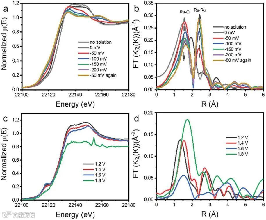 图3. (a)不同电位下的Ru K-edge XANES谱图(HER)及(b)对应的EXAFS曲线。(c) 不同电位下的Ru K-edge XANES谱图(OER)及(d)对应的EXAFS曲线。