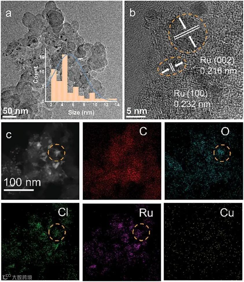 图1.(a,b) RuCu/C-3样品的TEM图像及右下角插图中的粒径直方图;(c)对应的元素分布图